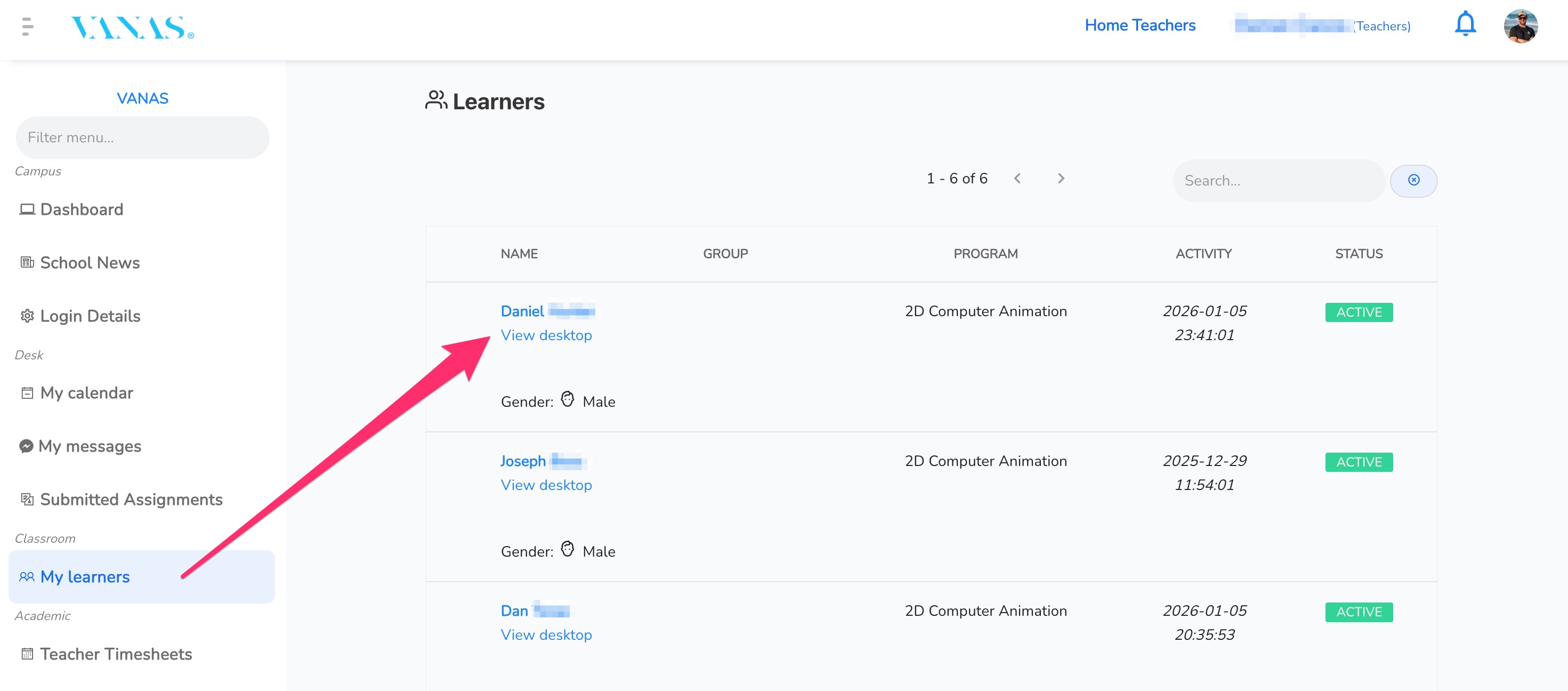 VANAS LMS provides multiple ways for administrators and teachers to view a learner’s desktop. Access depends on the user’s role and permissions within the system.